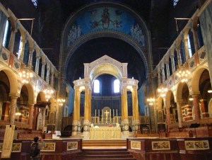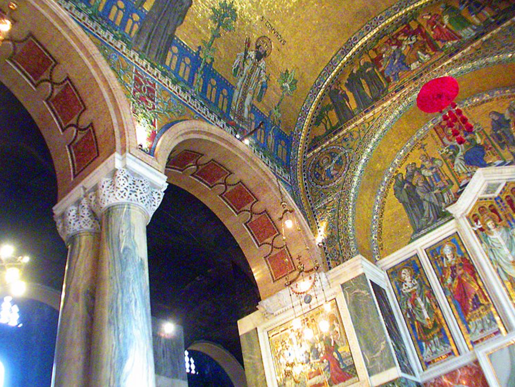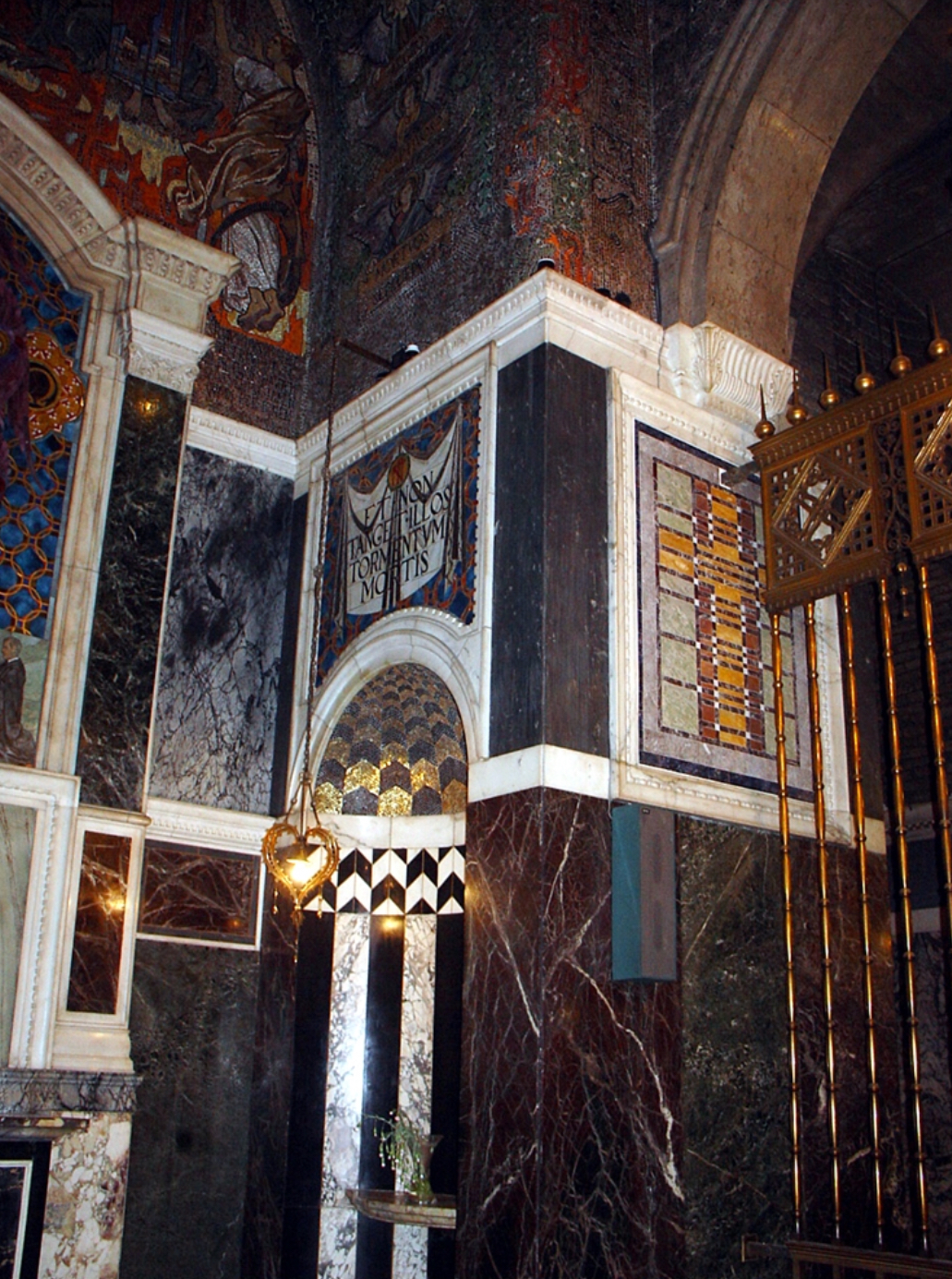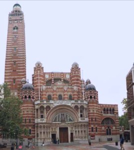 We visited the Cathedral first and noticed there were a few important differences from the C of E cathedrals we have been visiting. There was no charge at the door (and we did not have to pay to go to Durham Cathedral either) (a notable exception ) and prayer services and masses are said all day long. We came in at the tail end of the noon mass and just sat down. The church is made of red brick and the ceiling is plain, smoke blackened brick with no ornamentation at all and we were told that it is on purpose to make the ceiling look as if it is receding into the heavens. On the other hand, the church has side chapels down the sides of the nave and these are gorgeous. Around 150 different types of marble were used in the interior covering the walls, the floor and all of the chapels. The walls are magnificent but it is the mosaics that take one’s breath away. At first we thought we were looking at paintings but looking closer the artistry of what we were seeing became apparent. The tesserae were very small and many of them were made of golden glass, I don’t know how they did that, and the ceilings were like looking into a bit of Heaven. If I can pull some pictures off the internet I’ll put them in but there was absolutely no photography allowed in the church. I did find some photos. They take their church mission seriously. This is a very new Cathedral since it was started in 1897. It is very close to the Abby so I am guessing it was a late Victorian thumb on the nose to the Church of England. You can see the marble in these pictures and the purposely gloomy interior.
