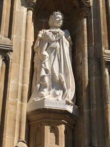 We finally made it to Canterbury cathedral and you would be surprised at the terrible shape it is in! There were stone masons and painters and sculptures working all over the place. I mean, I’d say it isn’t even all that old but in truth, they have been building and rebuilding that church for a thousand years so I shouldn’t be too put out that we couldn’t see the ceiling of the nave. They put a wooden ceiling up there because thay had to take the lead roof off, melt it down, recast it and put it back up. If there is a hole water will find it….I use straw and daub on my roof and it doesn’t work any where near as well as lead. They have carved new statues to replace some that are weather worn and that stained glass! It’s beautiful but it takes a lot of care. It’s a good thing that the lottery the Queen has going puts coin into it. Imagine, gambling to repair a church! It fairly makes my head swim. The people must be grateful because there are new statues of the Queen and her consort on the front of the cathedral.
