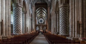 Another guest at The Gray Bull in Haltwhistle told us we must visit the cathedral at Durham witch is on the way to York….so we did, consistent with our policy to go where the locals point us. Durham Cathedral is Norman architecture, not ornate. The architect who designed it tried a new roof style that allowed this stone roof to sore many stories about the floor of the nave. Columns six meters in circumference and six meters in height supported somewhat smaller columns going up and up. The wider bases were all decorated with carving, rather simple but effective. The thing is, no photos were allowed inside the cathedral ….none at all…so I got a couple on line. You can see the carving on the posts and the pews for size comparison. No photo can do any justice to these immense churches. There was no charge to go into the building either as there mostly is in these big churches. The national lottery gives money to help these cathedrals…and smaller churches. It is the only way to preserve them as it costs so much to run them (18,000 pounds a day at Salisbury and 20,000 at York). Even British people are surprised at this cost. We do our bit here just as we do at First Parish.