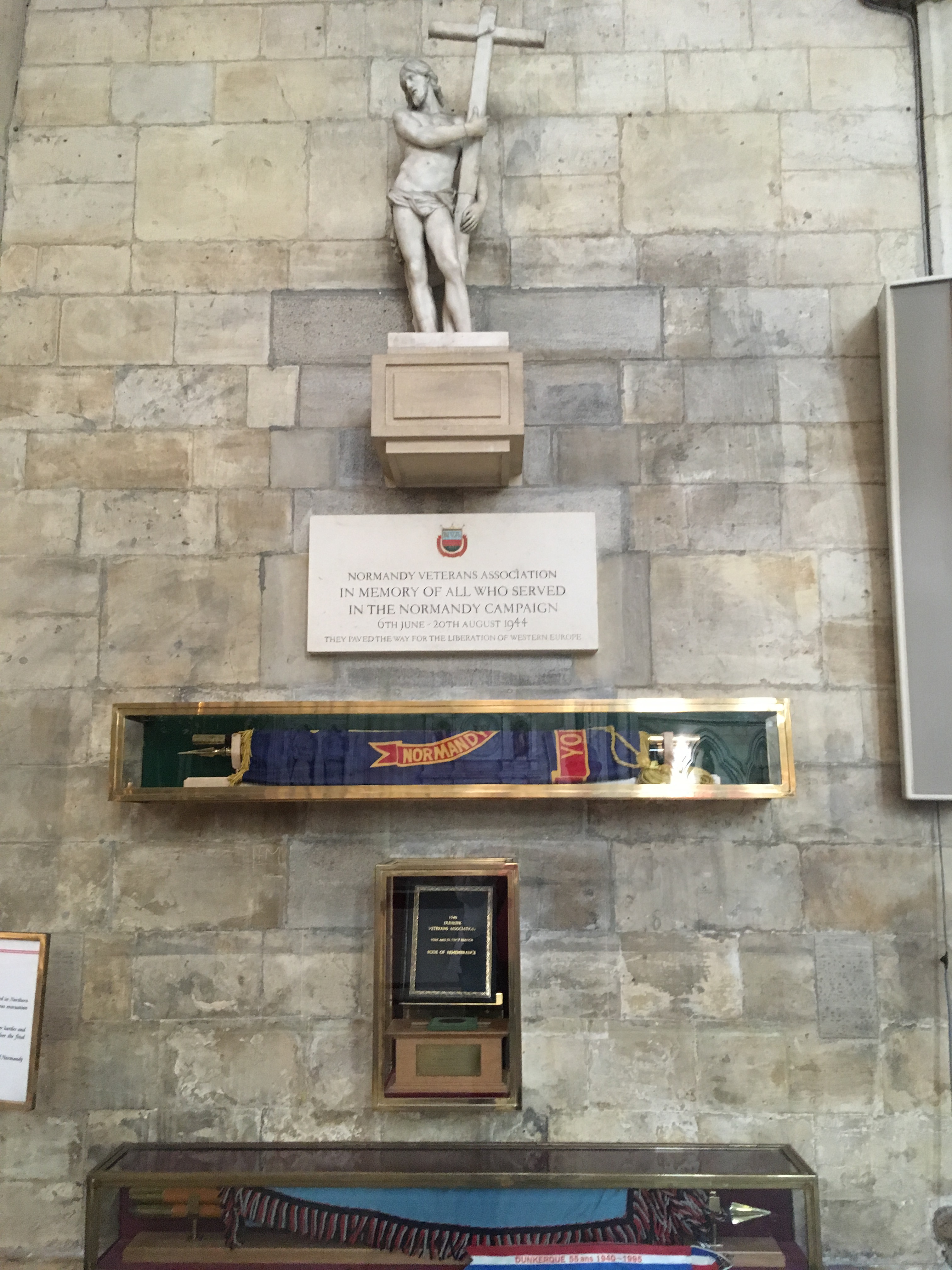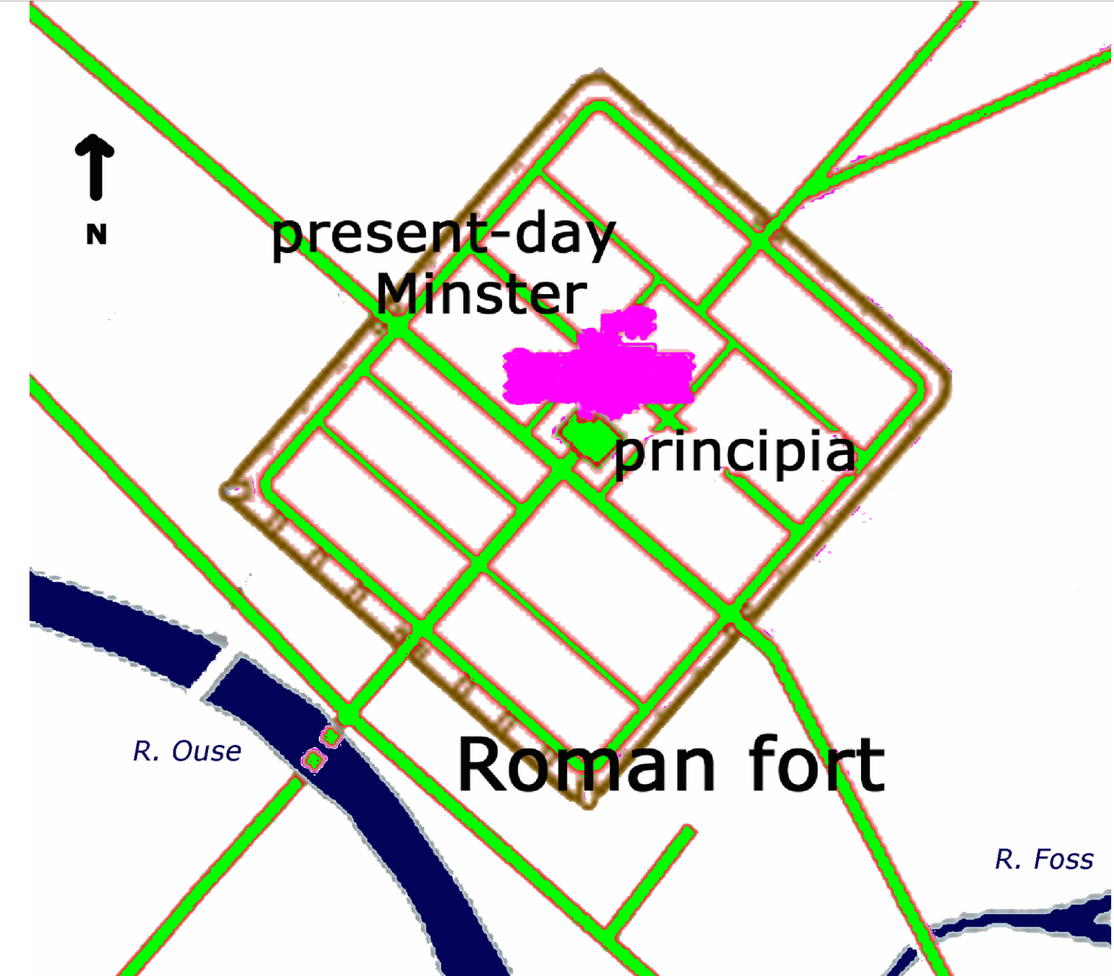 We have been at Evensong in Salisbury and in Glouster and now in York Minster. If I lived in York I would be there then as often as possible. The service was just as lovely as the others, (the choir master in Glouster was better) but the organist! He did not stint with stops. The postlude was the Allegro from the Sixth Symphony by Widor. You can google that but your speakers won’t do it justice. It shook the cathedral! I could almost feel it in my bones and I had the fantasy that the sound waves were penetrating my body and reverberating there. The organ loft…Since I was there last, in 2007, they refurbished the window in the Mary Chapel. (The quire is behind the lecturn…we sat on the left). (Wall memorial to the men of Patton’s army with whom Eric’s dad served as Chaplin in WWII). All the cathedrals are putting thermal glass on the outside of their windows to help preserve them. Some of those stained glass windows are around a thousand years old and rebuilding them and saving them is, besides expensive, difficult and time consuming and so worth it. Durham is a World Heritage site just as Stonehenge is. There are the ruins of a Roman garrison beneath York Minster and the surrounding old town. This garrison held an entire legion of 5000 men, five times the size of the fort at Hadrian’s Wall. This was a major Roman center from which they deployed men to various areas to ‘keep the peace’, which, until they were recalled to Rome, they did admirably. These remains were found when, back in the ‘50s, they excavated to find out why the central tower was sagging. It was built on the remains of previous foundations which were not adequate to hold up any part of York Minster. (Here is an archeologist in the ‘50s finding the rubble holding up the tower and a picture of what they were saving). Under that they found the garrison, which in its hay day was many times bigger than the cathedral enclosure.