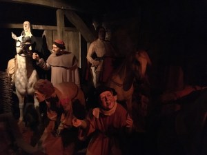 We visited a memorial to a pilgrimage that took place in 1389 or so. I don’t know why their tales are any better than ours but that’s history for you. We had to pay a penny to go in and I’ll tell you, I was saving that penny for a big mug of ale and a beef pie for my dinner. But it was worth it to see those pilgrims of yore and hear their tales…that old dame had five husbands (not all at once) and she choose the last one because she admired his thighs as he carried her forth deceased husband’s casket! Now that’s a women…keeping her priorities straight. That’s her telling her tale and below her are some of the other characters who told tales.