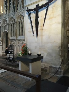 But they have to keep the place up for us pilgrims so we can visit the place Becket was offed by King Edward II. He made Becket Archbishop because he thought that he could control the church better but Becket began to become the role and they differed on who got to do what. After Becket’s death Edward want on a pilgrimage of his own and walked two miles barefoot in the snow to show his contrition. He didn’t mean to have him killed and tried to call the men back when he found out what they intended. He was very sorry because Becket was his closest friend. We visited the exact place Becket was murdered and I’ll tell you, it gives one the chills what with those swords on the wall behind! And that doggone Henry VIII! He destroyed Beckets tomb. But folks have the last laugh, there is a always candle burning in the exact spot of his tomb.