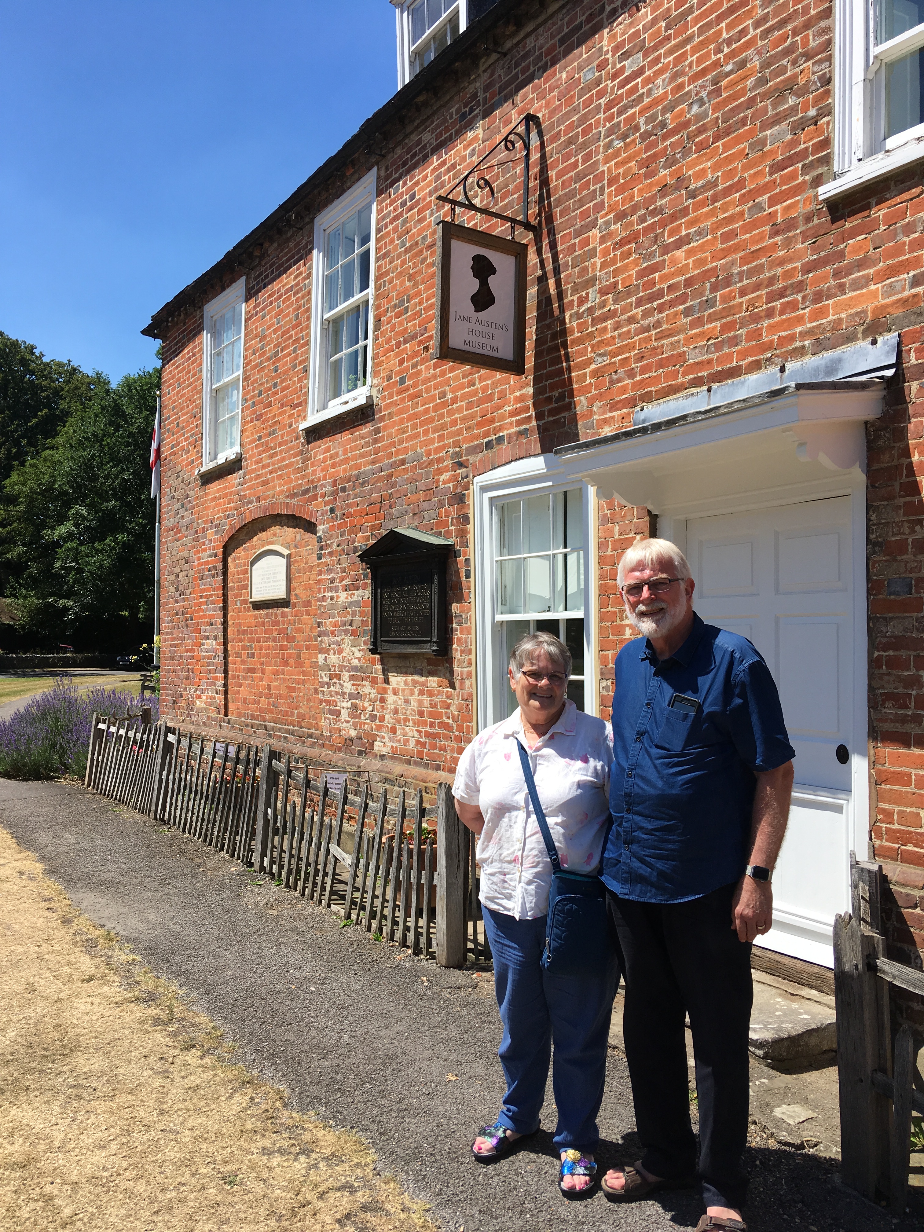 From Canterbury we drove south west to the town where Jane Austen lived and wrote her stories. The area is very beautiful and seemingly rural but actually quite densely populated. Some kind tourists from Cambridge took our photo outside Jane’s house.