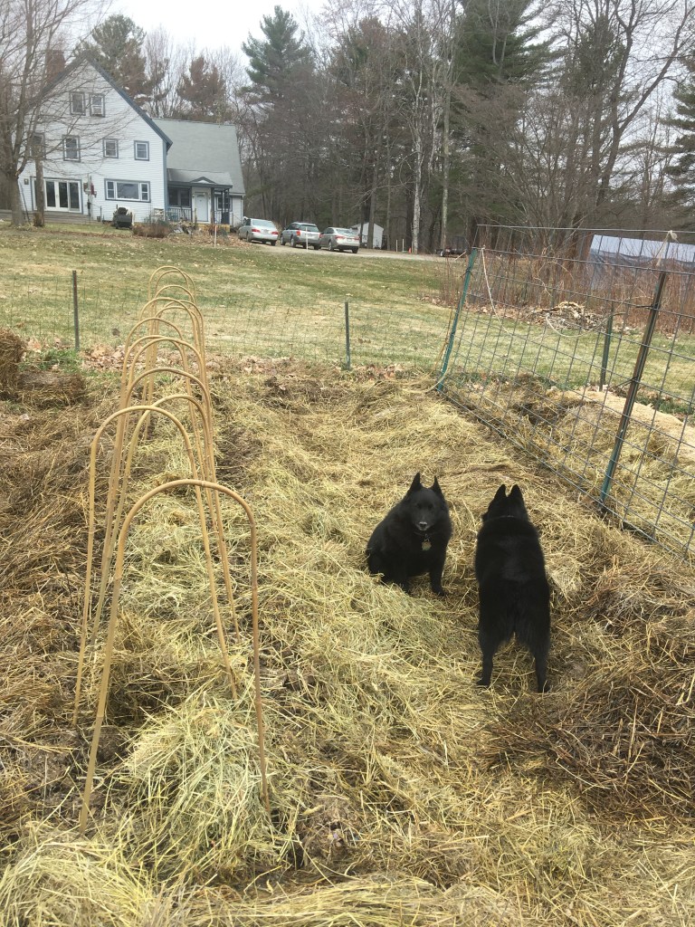 Oliver and Dante enjoying the freshly hayed raised beds with Sugar Snap peas on the cow panel to the right and First 13 peas on the left with bamboo hoops as stakes.